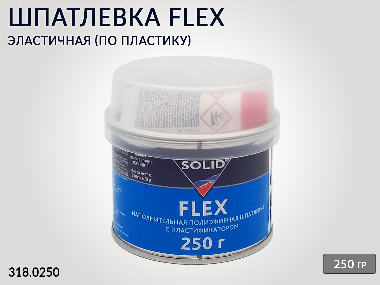 Эластичная шпатлевка FLEX SOLID (318.0250) это двухкомпонентная полиэфирная шпатлевка по пластику, предназначенная для кузовного ремонта. Рекомендуется для ремонта элементов кузова из пластмассы, подверженных вибрации.
