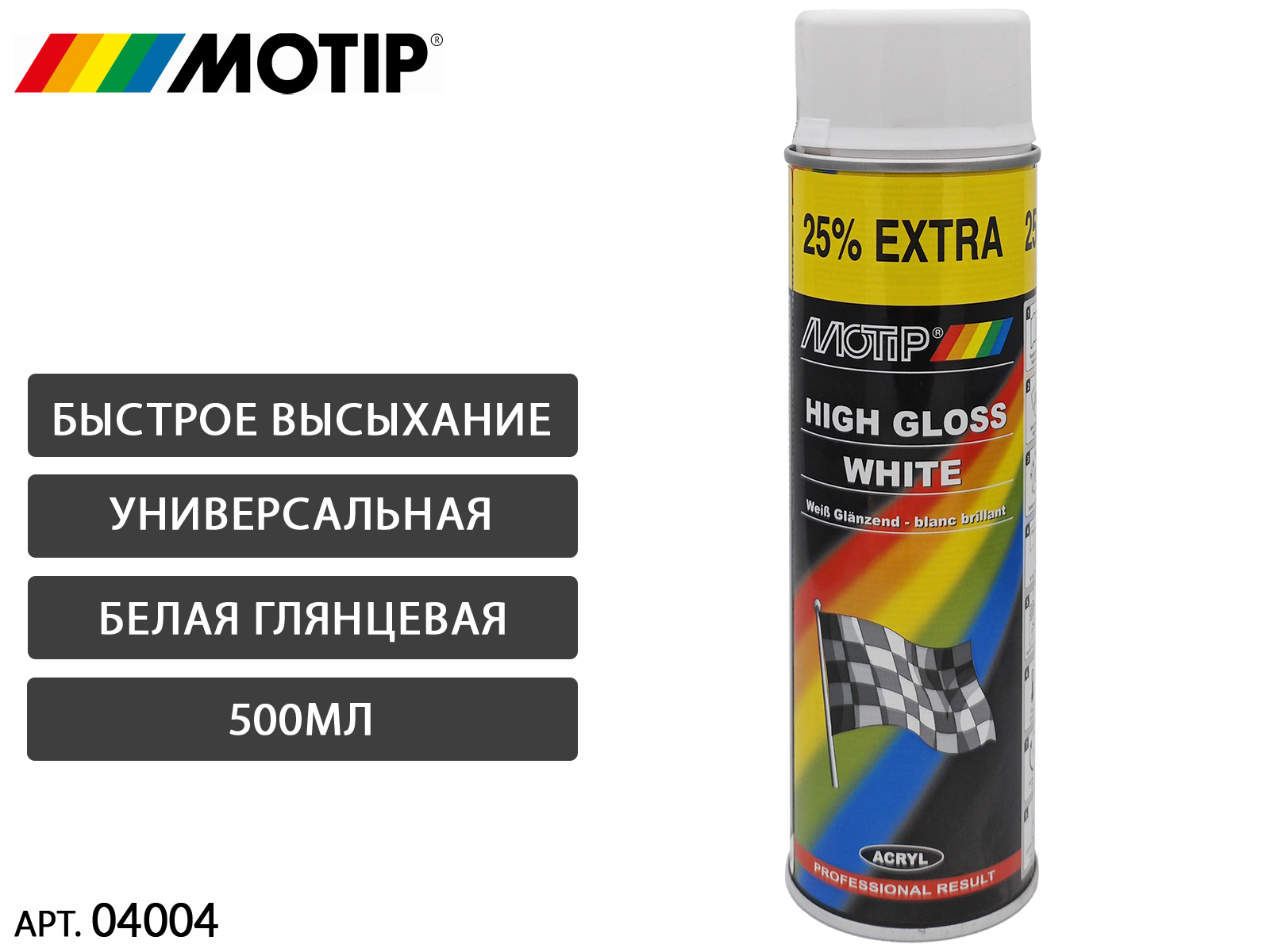 Универсальная глянцевая аэрозольная краска MOTIP - высококачественная акриловая аэрозольная краска широкого спектра применения для автомобиля и других областей. Отличается великолепной укрывистостью, схватываемостью, прочностью и долговечностью покрытия.