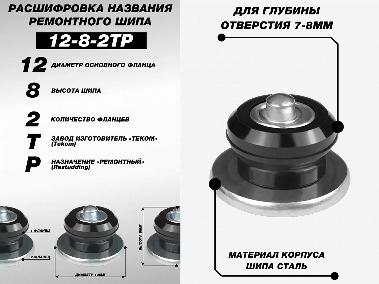 Ремонтные шипы 12-8-2ТР РЕМШИП (000238) предназначены для восстановления ошиповки на зимних шинах легкового и грузового транспорта. Устанавливаются с использованием специальных приспособлений взамен изношенных, сломанных или выпавших заводских шипов. Ошиповка осуществляется в те же отверстия, где находились заводские шипы.