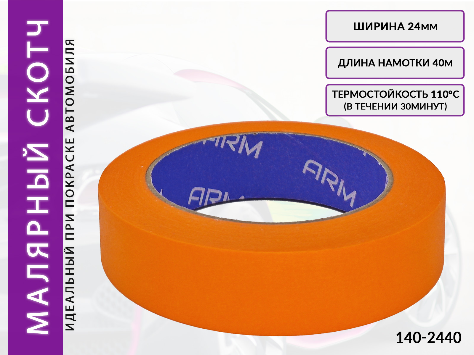 Профессиональная малярная маскирующая лента ARM (140-2440) оранжевого цвета предназначена для закрепления маскировочных материалов при покрасочных работах автомобиля или любых других конструкций, обладает очень хорошей устойчивостью к средним и высоким температурам.