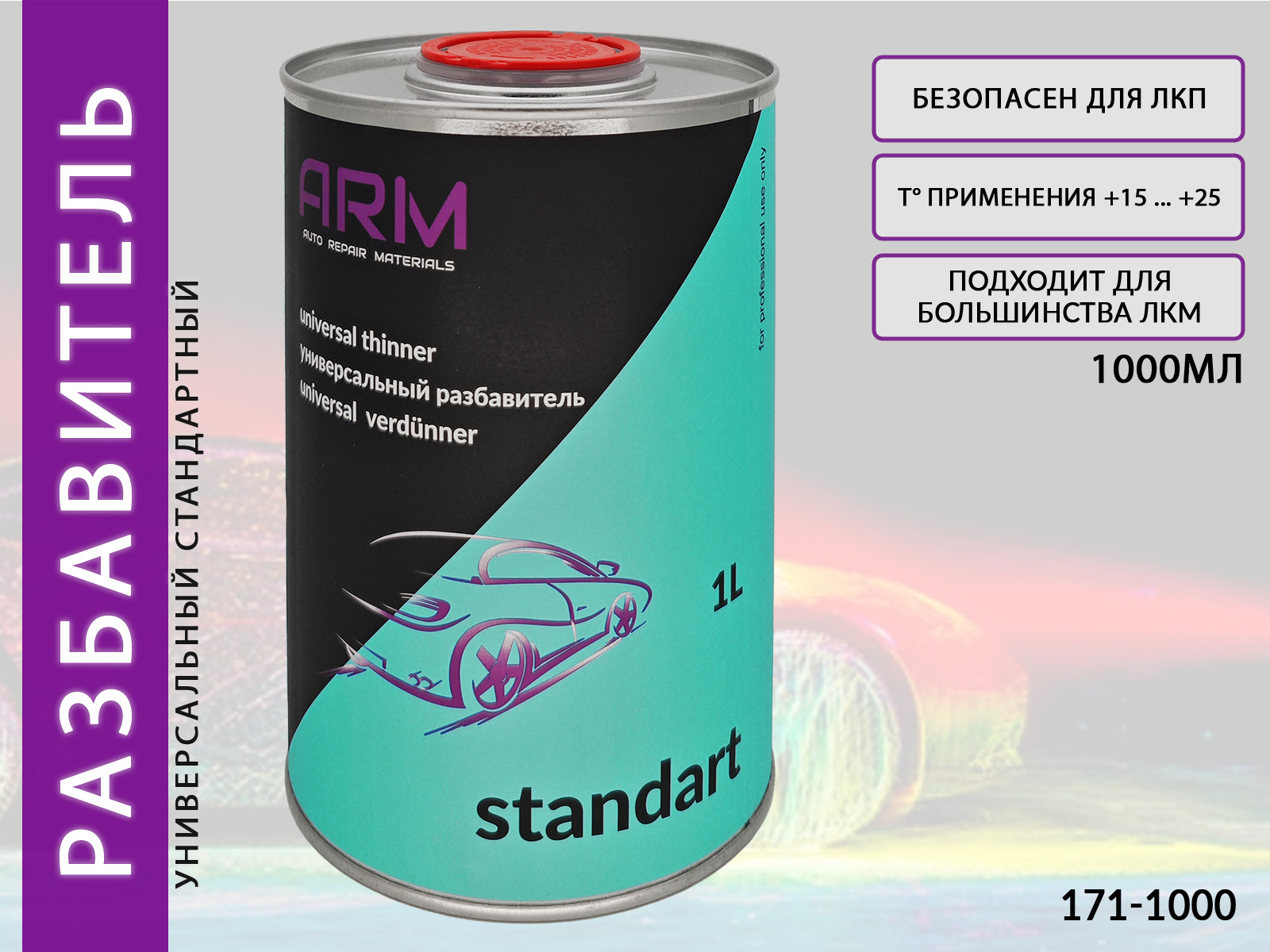 Универсальный разбавитель STANDARD ARM предназначен для разбавления лакокрасочных материалов (акриловые лаки, грунты, базовые эмали) на органической основе до нужной вязкости (10-50%, основываясь на технической документации по конкретным материалам).