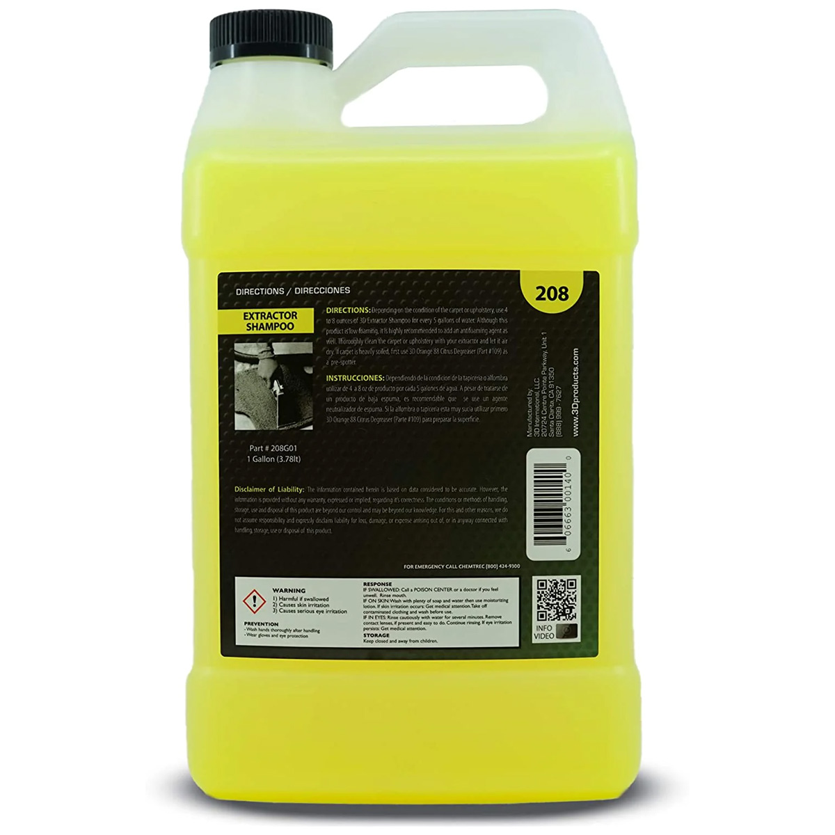 Автошампунь для ковров/ткани/потолка 208 EXTRACTOR SHAMPOO низкопенный 3D (3,78л)