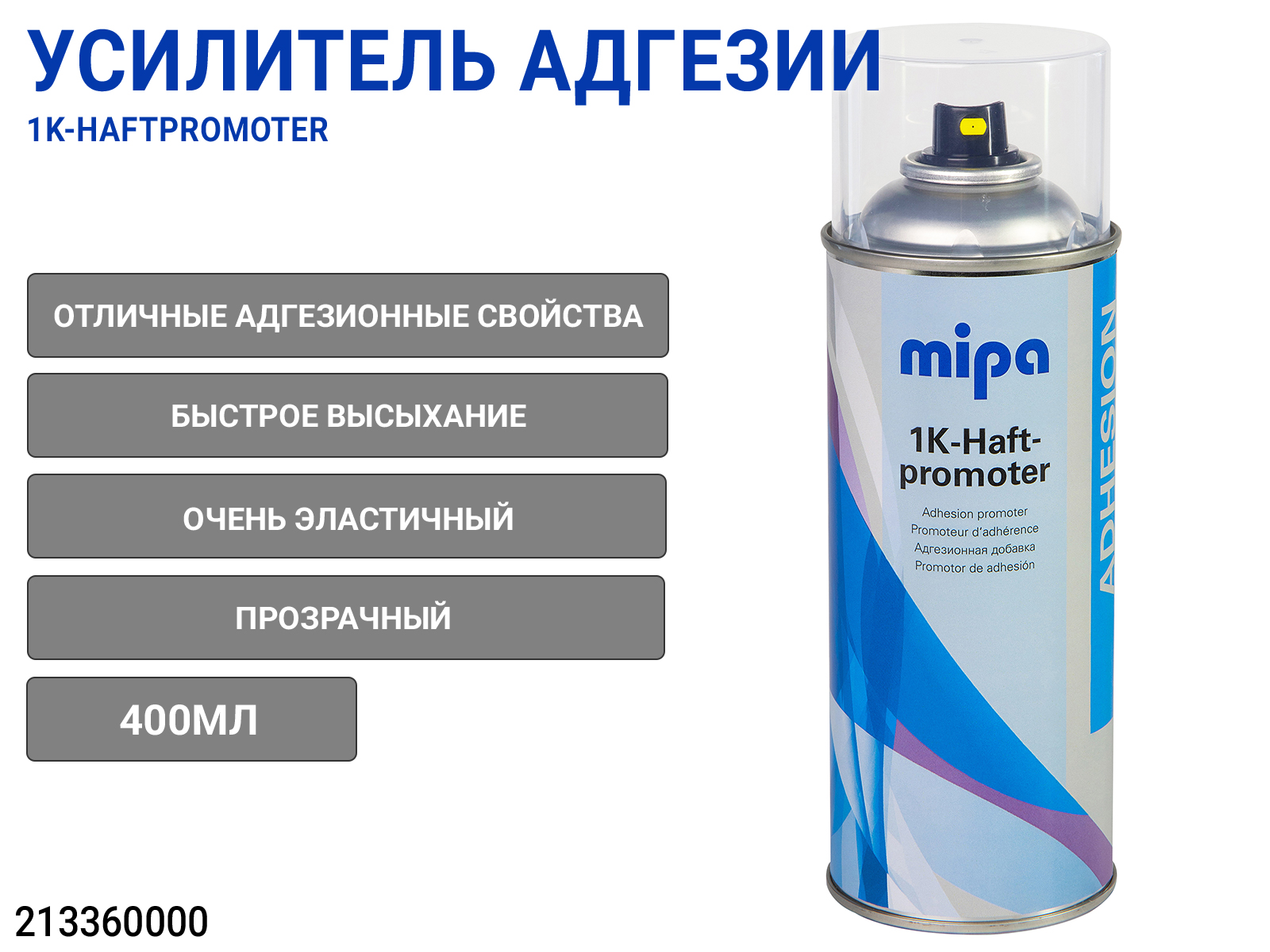 шлифовки. Экономный по времени: так как материал быстро сохнет, хорошо перекрывается и не требует шлифования. Перекрывается верхними покрытиями 1K и 2K. Mipa 1K-Haftpromoter прозрачный, устойчив к ультрафиолетовому