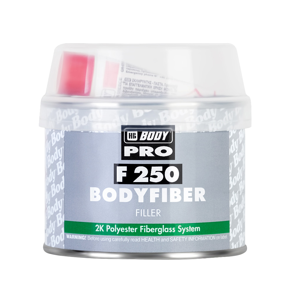 Двухкомпонентный полиэфирная шпатлевка F250 BODY со стекловолокном для заполнения больших углублений и сквозных отверстий. Также используется для ремонта корродированных частей кузова и армирования ослабленного металла. Равномерно наносится, быстро сохнет и легко шлифуется абразивной бумагой Р80–Р120. Позволяет получить эластичное и устойчивое к механическим воздействиям покрытие.