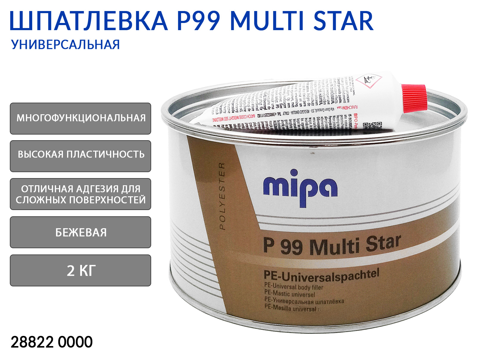 Многофункциональная шпатлевка P-99 Multi-Star MIPA (28822 0000) — двухкомпонентная полиэфирная шпатлевка, рекомендуется как основная шпатлевка при необходимости восстановления стальных, оцинкованных покрытий и стекловолокна. Благодаря тонкой и однородной структуре, применяется на всех этапах подготовки и при салонных работ, как наполнительная и финишная.