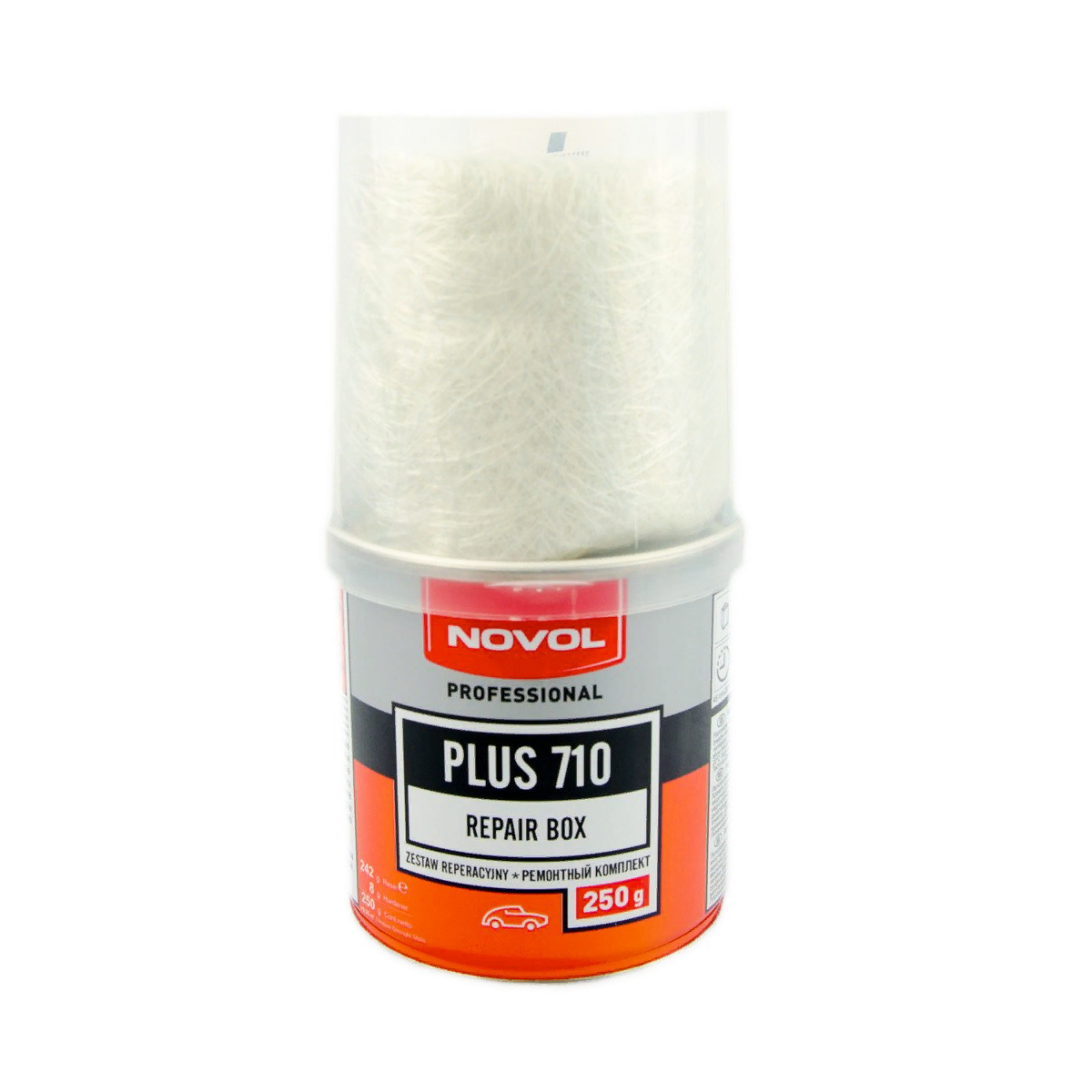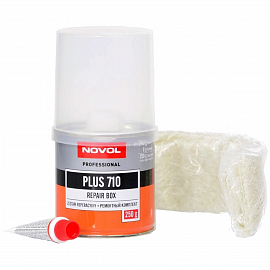 Ремонтный комплект PLUS 710 NOVOL состоит из полиэфирной смолы, отвердителя и стекломата. Образованный из него пластик обладает очень высокой механической прочностью и предназначен для заполнения значительных убытков материала (вызванных например коррозией), для укрепления и фиксации металлических, а также пластмассовых поверхностей. После отвердевания может шлифоваться и покрываться любыми полиэфирными шпатлёвками для получения необходимой гладкой поверхности. Продукт предназначен для широкого применения при малярных и отделочных работах по металлу, дереву, бетону и пластмассе.