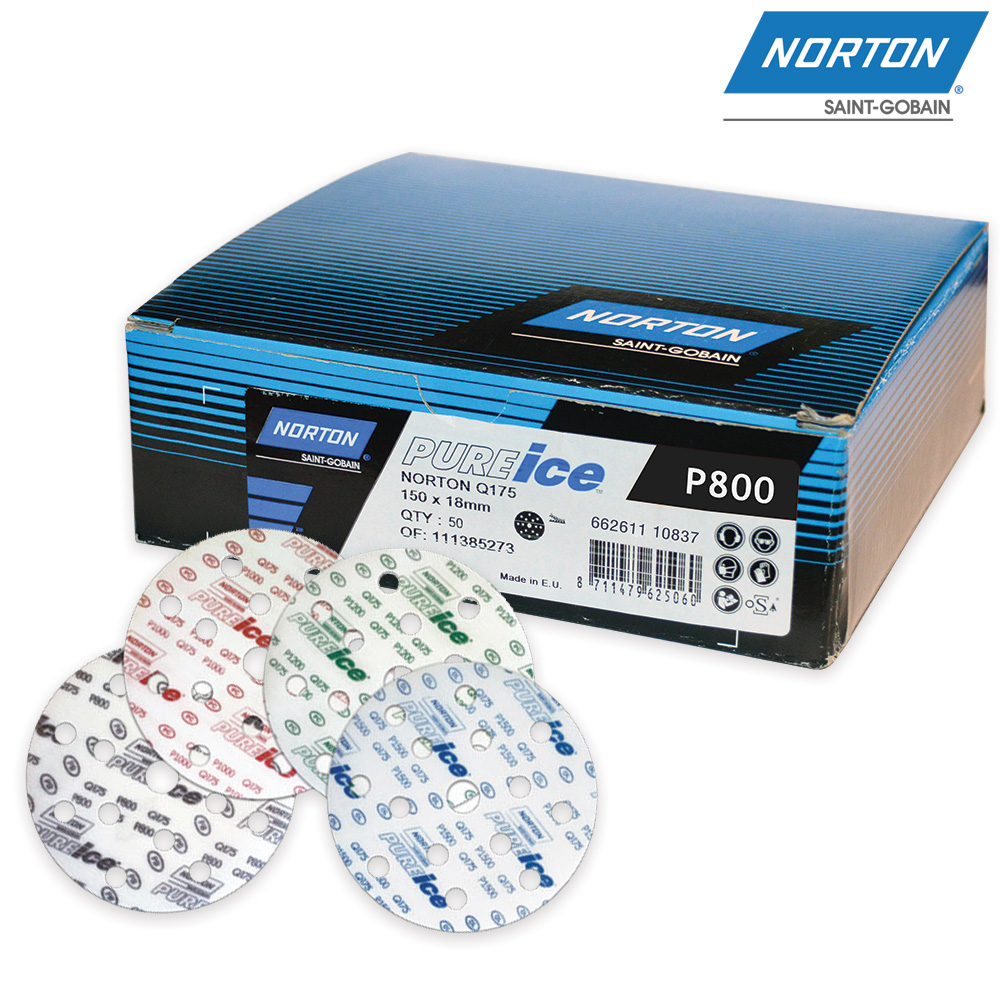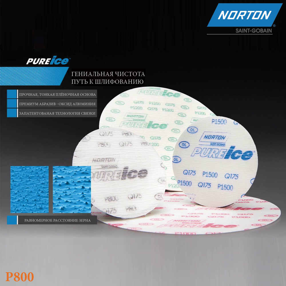 Абразивные круги P800 PURE ICE Q175 NORTON (66261110837) - прочная, тонкая плёночная основа с премиальным абразивным зерном оксида алюминия по запатентованной технологии связки придает плоскостность поверхностям, противостоит засаливанию, обеспечивает долгий срок службы и оставляет однородную конечную поверхность для быстрой полировки. Благодаря великолепной оболочке No-Fil засаливание круга минимальное, что даёт в результате гораздо больший срок службы продукта.