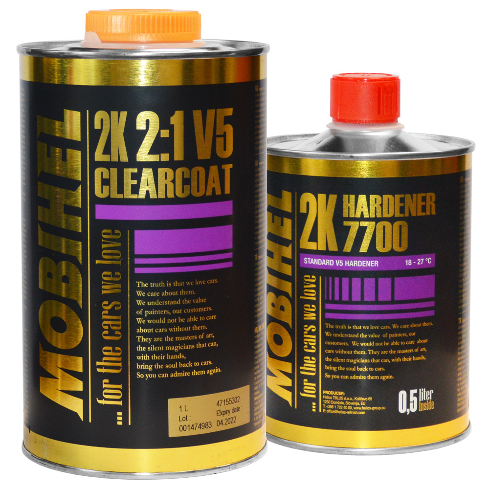 MOBIHEL 2К V5 2:1 АКРИЛОВЫЙ БЕСЦВЕТНЫЙ ЛАК. Последние технологические разработки позволили концерну «HELIOS» совместить в этом продукте низкую цену и высокое качество. Лак MOBIHEL 2К V5 2:1- это качественный прозрачный лак, отличительными особенностями которого являются: Высокий стабильный блеск. Высокий сухой остаток (470-480 гр./л, выше, чем у MS лаков. Разводится 2:1 отвердителем 7700, без добавления разбавителя. Отлично полируется после сушки. Автомобильный лак пригоден для работы в любых условиях.