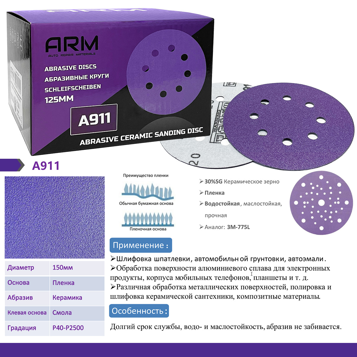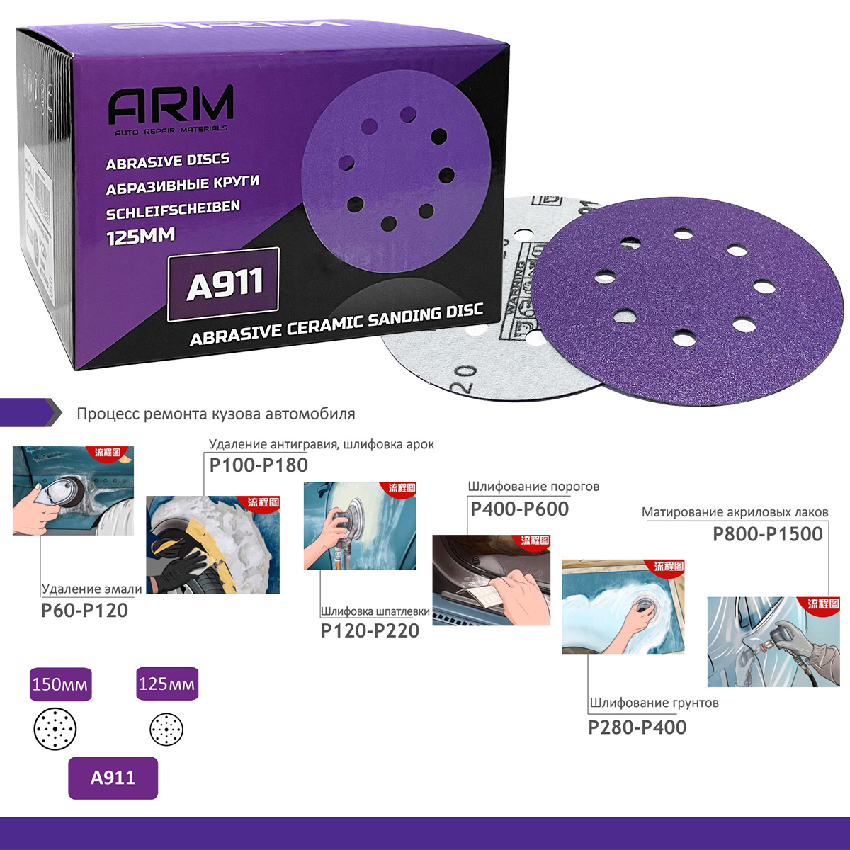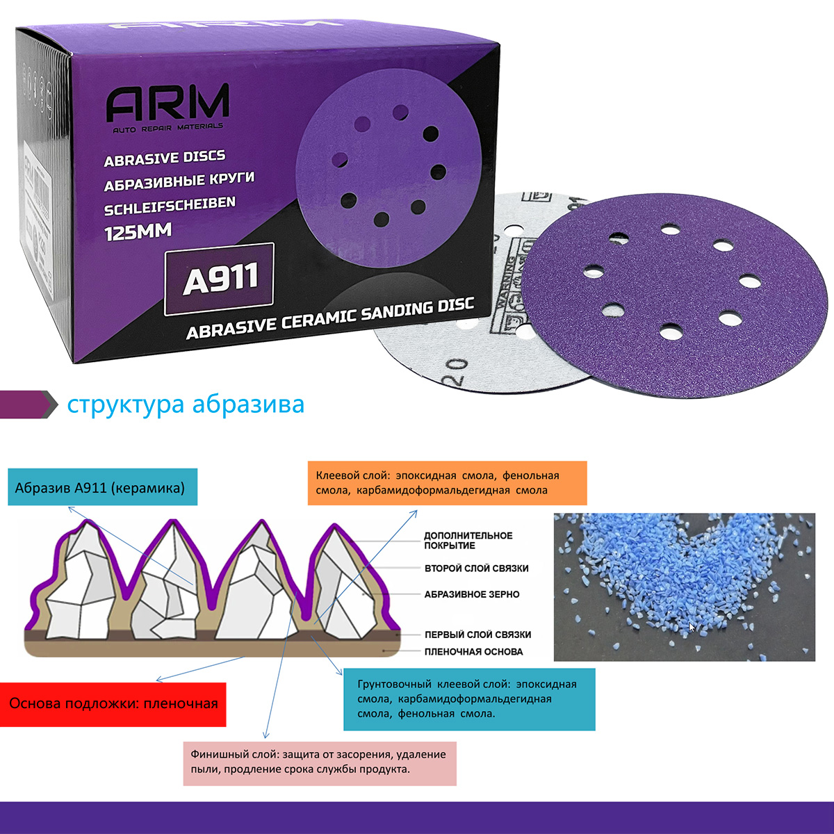 Шлифовальный абразивный круг A911 ARM диаметром 125мм с керамическим зерном и 8 отверстиями идеально подходят для удаления краски, грубой обработки кузовной шпатлевки, тонкой обработки краев и окончательной подготовки перед полировкой или грунтованием. Фиолетовые круги серии А911 от ARM обеспечивают превосходную резку, результат быстрее других высококачественные абразивов, а также обладают отличным сроком службы на основных этапах кузовного ремонта. Поверхность абразивного круга состоит из острых треугольных зерен, каждое из которых работает как отдельный режущий элемент для удаления лакокрасочных материалов. При производстве керамических шлифовальных кругов АРМ используется плёночная подложка и мощный клеевой состав.