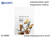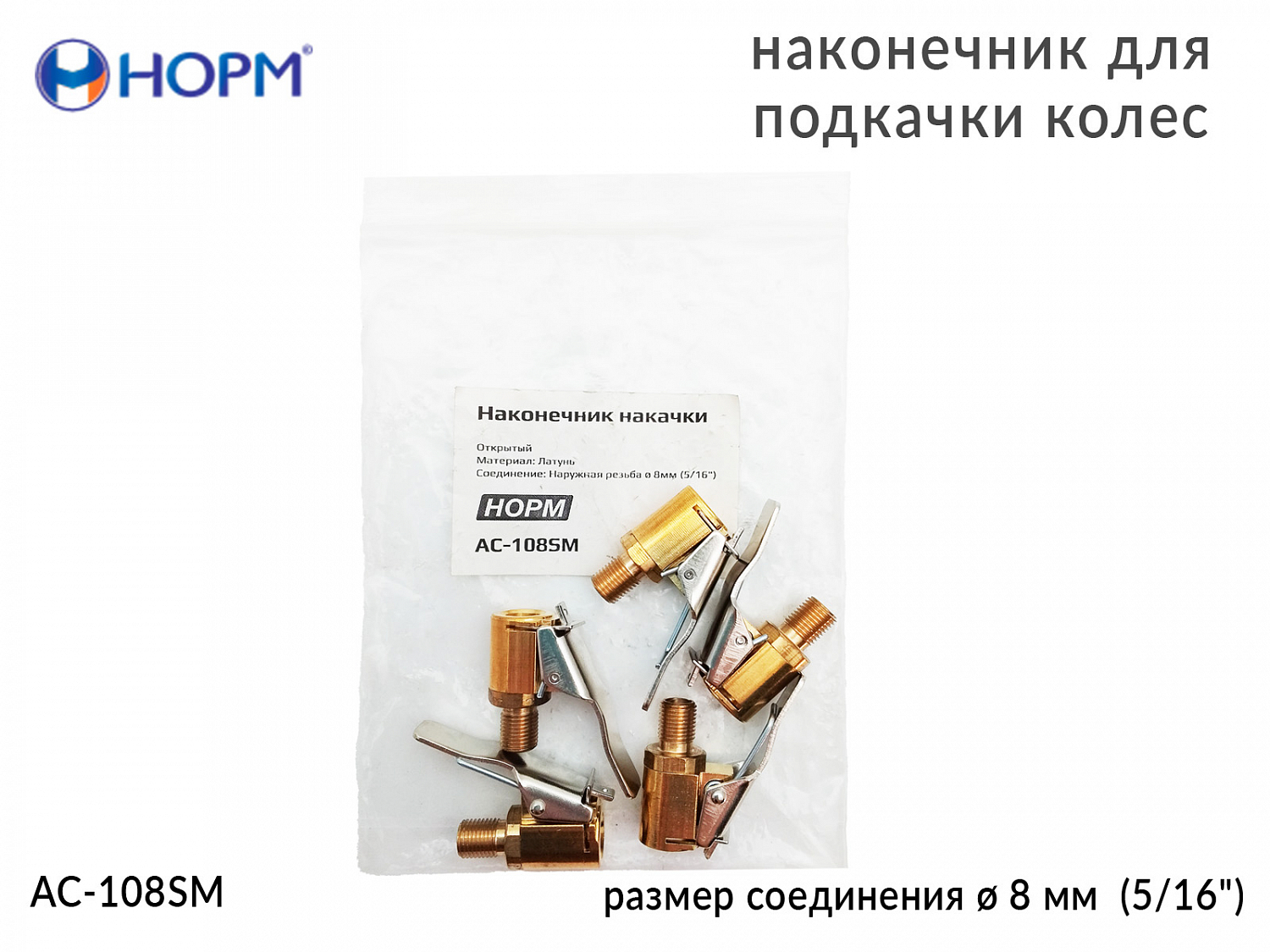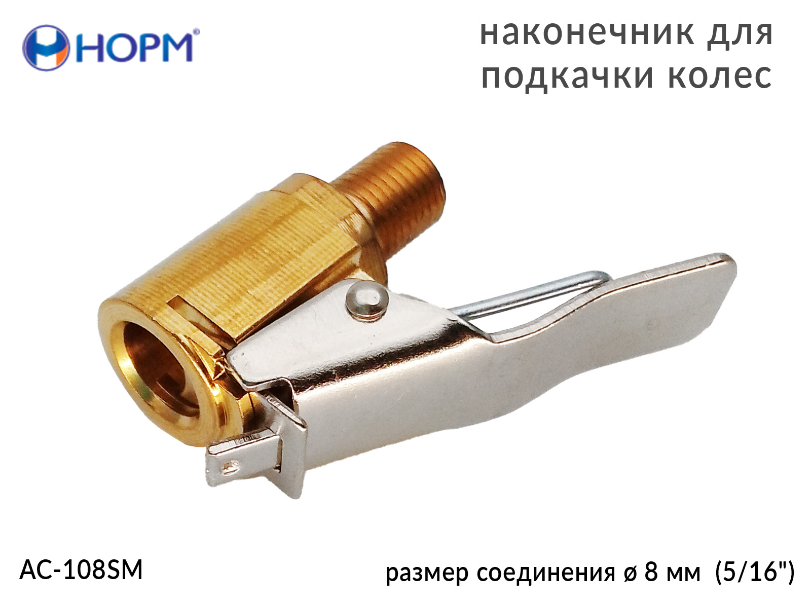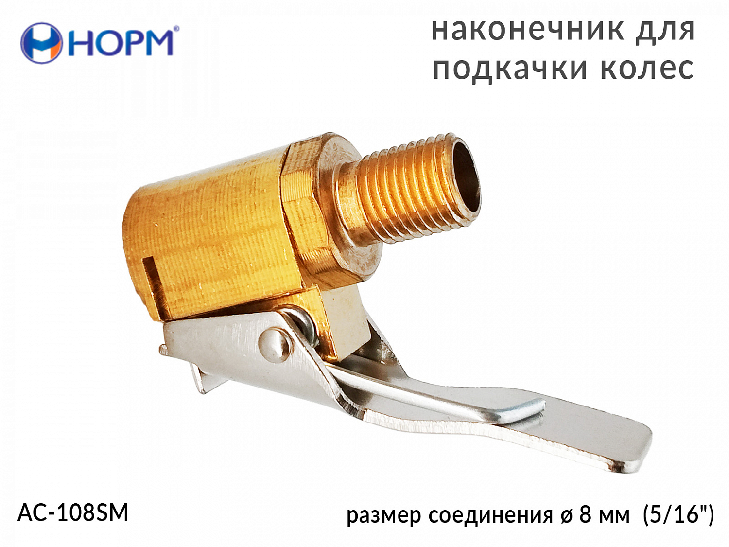 Наконечник для подкачки колес НОРМ (AC-108SM) устанавливается на конце воздушного шланга пистолета для подкачки колес, предназначен для жёсткой сцепки воздушного шланга и вентиля автомобильной покрышки. Переходник изготовлен из металла(латунь).