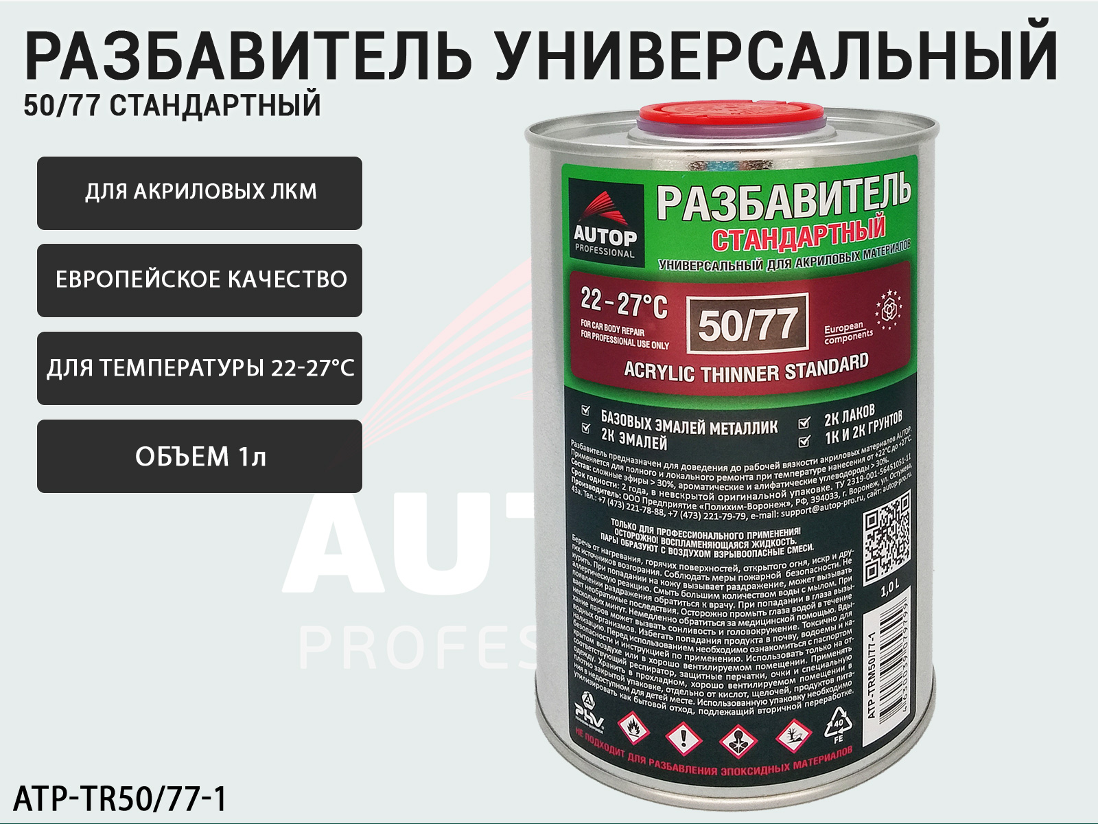 Стандартный акриловый разбавитель 50/77 AUTOP PROFESSIONAL (ATP-TR50/77-1) предназначен для доведения лакокрасочных материалов до рабочей вязкости 1К и 2К акриловых и базовых автоэмалей (в т.ч. лаков и грунтов) при покраске автомобиля. Растворитель 50/77 рекомендуется применять для полного и логольного ремонта деталей при температуре нанесения от +22°С до +27°С с предварительным тестированием.