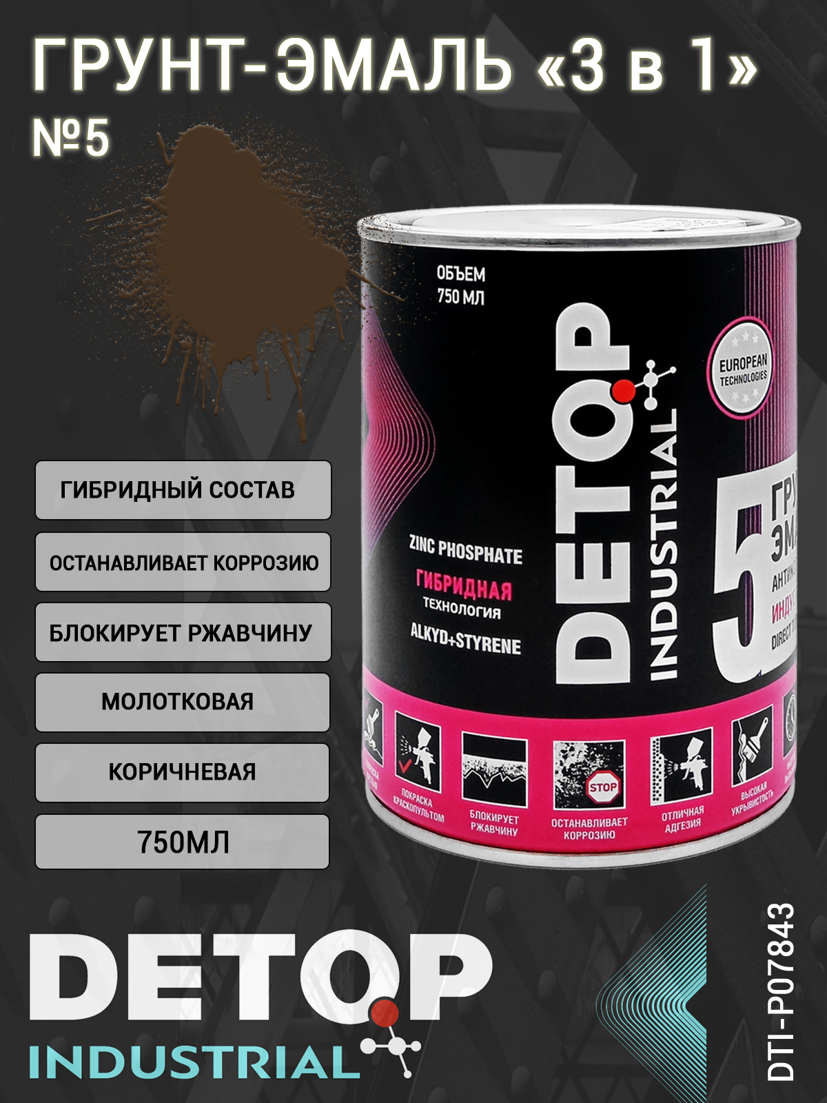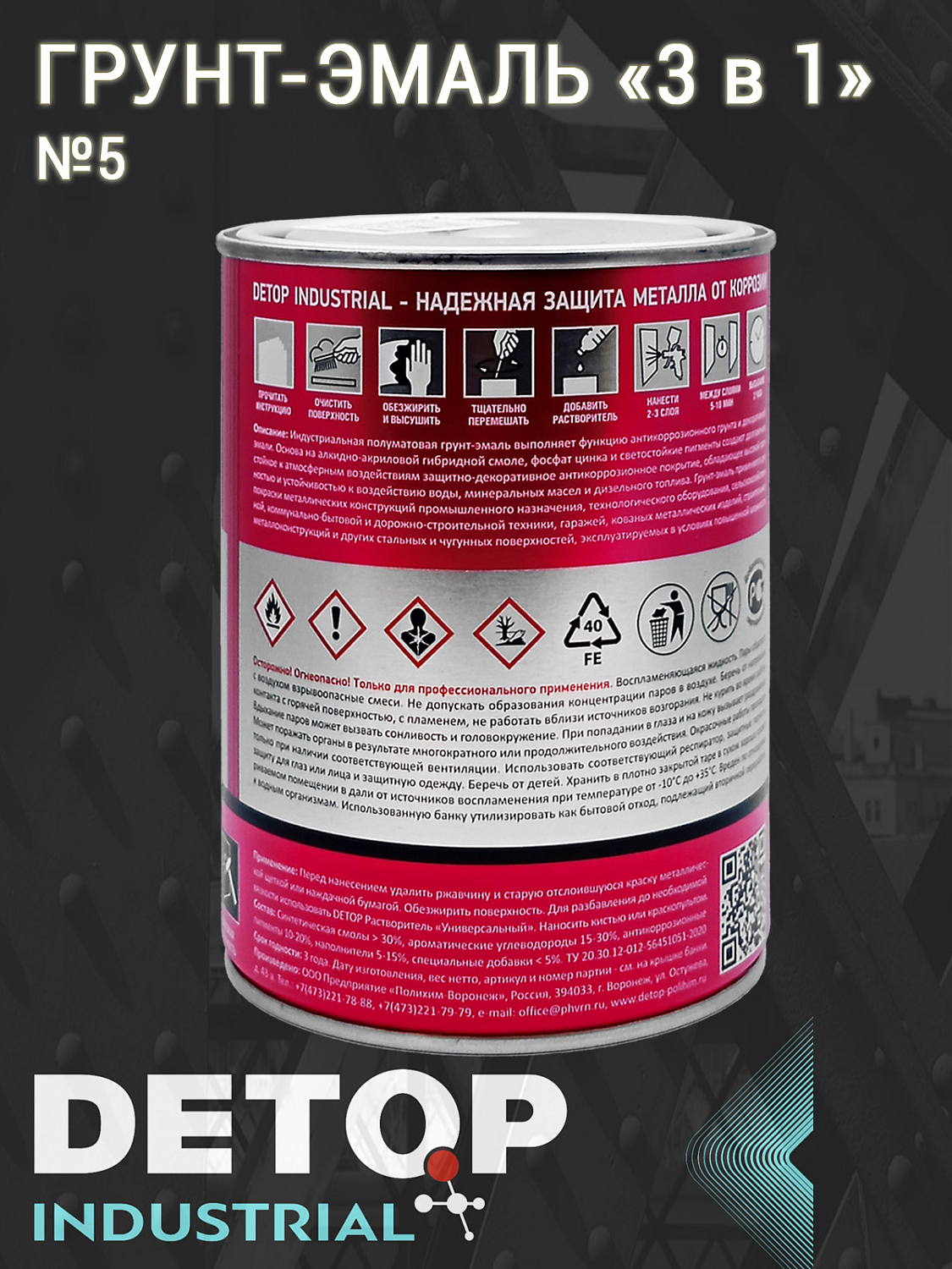 Грунт-эмаль №5 DETOP (DTI-P07843) — профессиональное средство для антикоррозионной обработки различных металлических поверхностей. Объединяет грунтовку, антикорр и эмаль, экономя время на покраске. Защищает металл от солей, влаги и ударов на 5+ лет. Индустриальная грунт-эмаль выполняет функцию антикоррозионного грунта и декоративной эмали. Основа на алкидно-акриловой гибридной смоле, фосфат цинка и светостойкие пигменты создают долговечное стойкое к атмосферным воздействиям защитно-декоративное антикоррозионное покрытие, обладающее высокой прочностью и устойчивостью к воздействию воды, минеральных масел и дизельного топлива. Грунт-эмаль применяется для покраски металлических конструкций промышленного назначения, технологического оборудования, сельскохозяйственной, коммунально-бытовой и дорожно-строительной техники, гаражей, кованых металлических изделий, строительных металлоконструкций и других стальных и чугунных поверхностей, эксплуатируемых в условиях повышенной влажности.