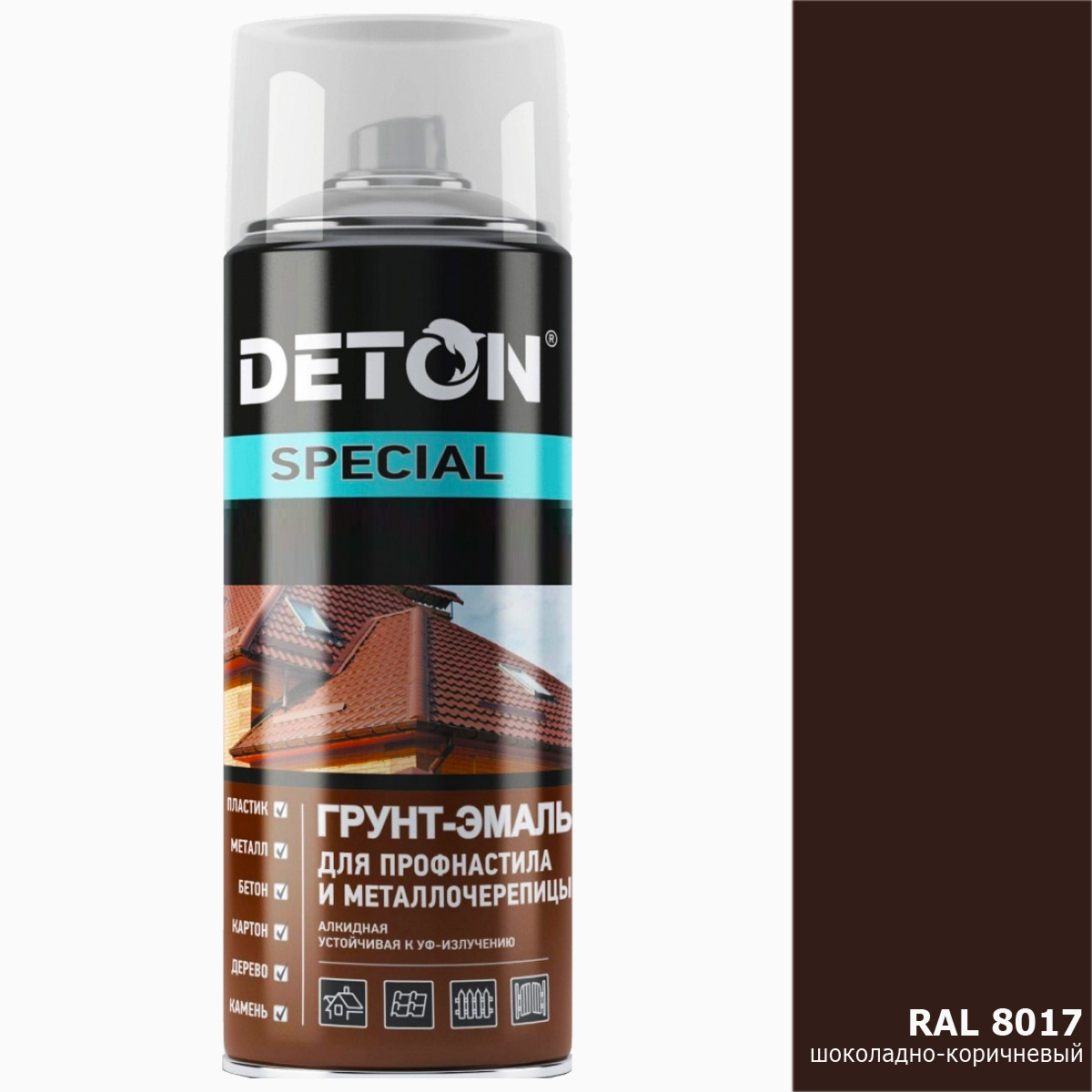 1. грунт-эмаль RAL 8017 шоколадно-коричневый для профнастила и металлочерепицы DETON (аэрозоль, 520мл) 1