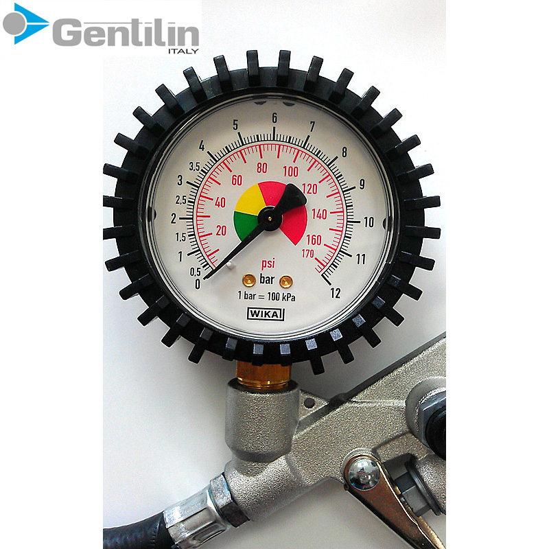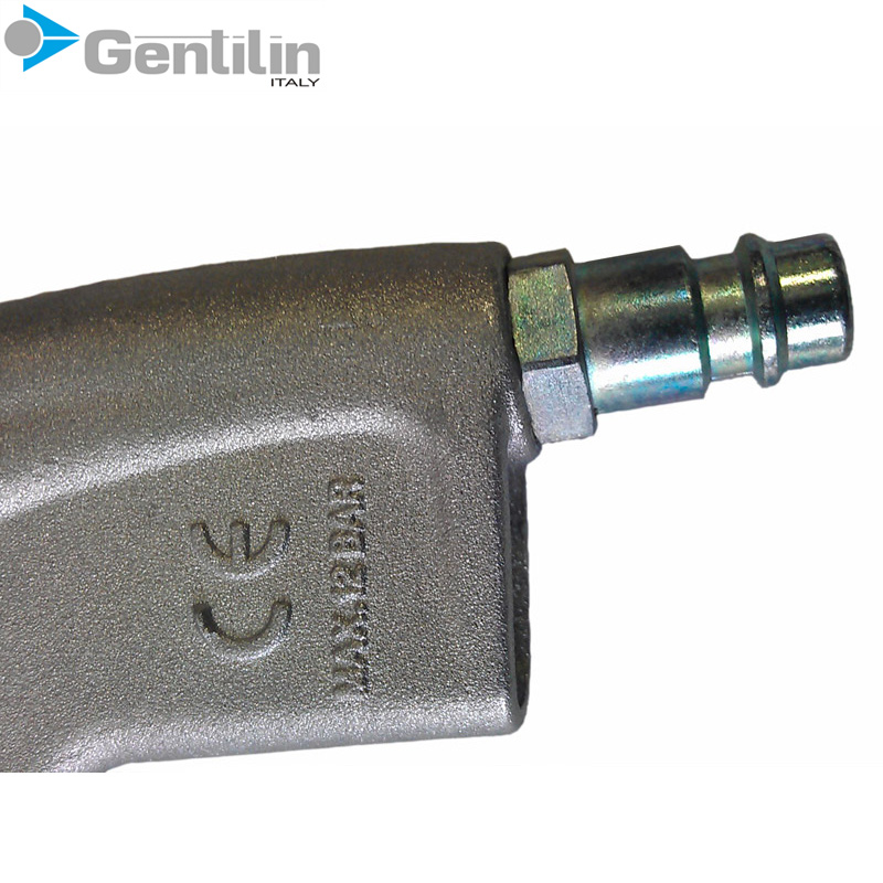 Пистолет для подкачки GUN1 GENTILIN (Италия), предназначенный для накачки автомобильных колёс, имеет фронтальное расположение манометра. При подключении через шланг к источнику сжатого воздуха готов к работе.