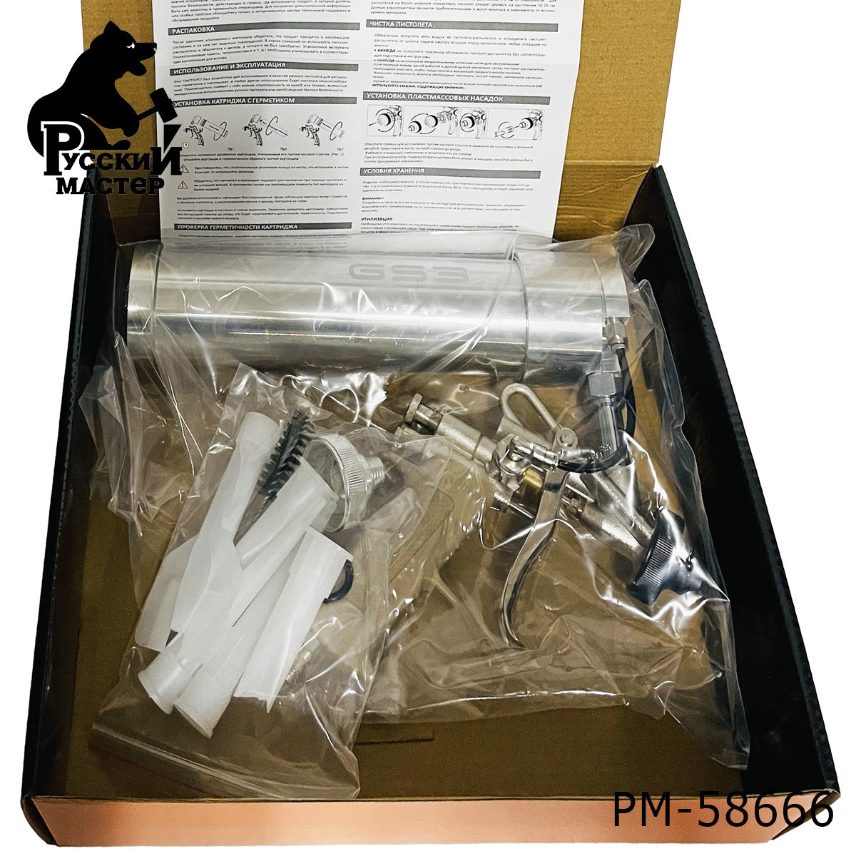Пневматический пистолет с регулятором давления GS3 РУССКИЙ МАСТЕР (PM-58666) предназначен для нанесения распыляемых (напыляемых) и шовных герметиков, фасованных в картриджах объёмом 310мл.