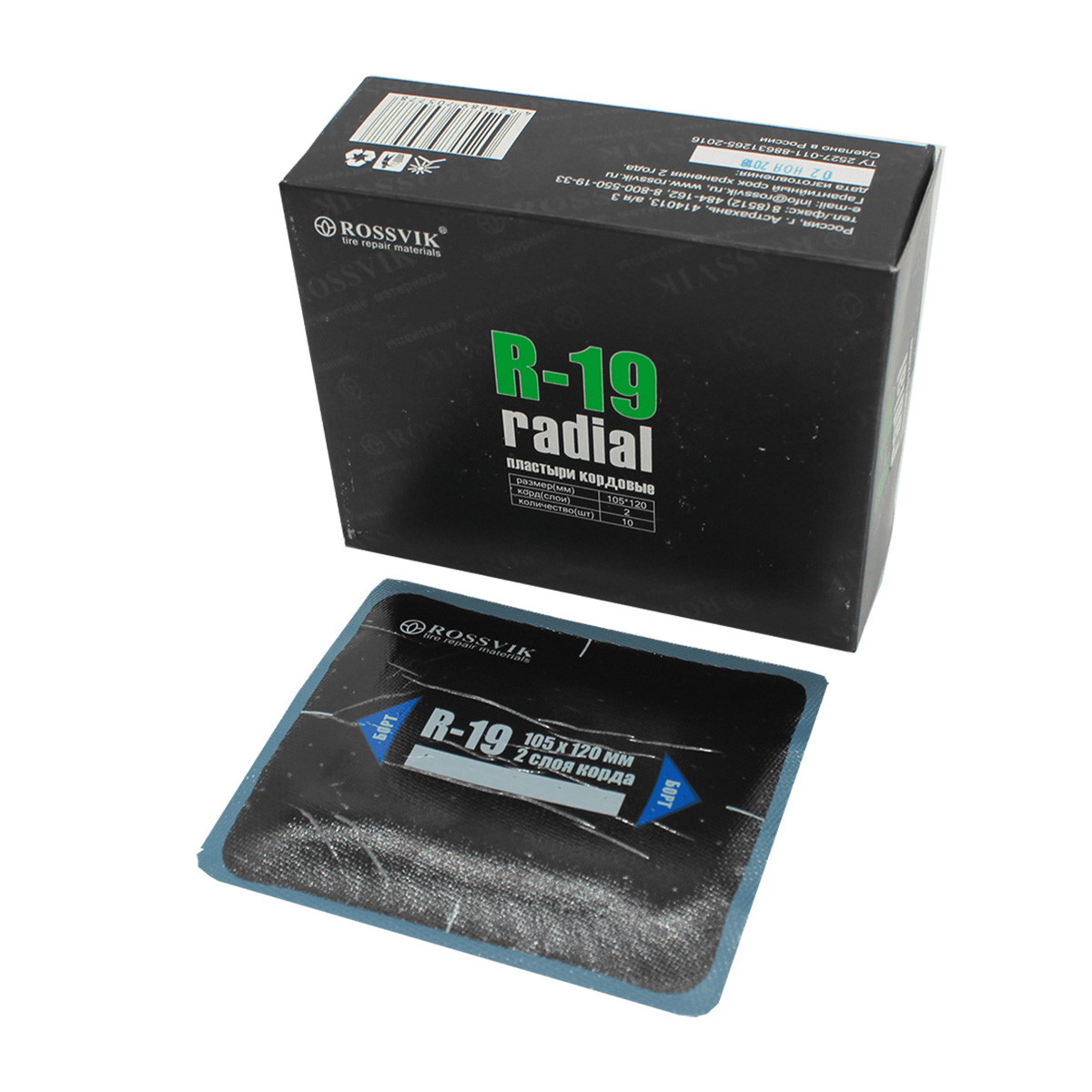 Радиальная кордовая заплатка R-19 холодной вулканизации ROSSVIK предназначена для ремонта всех типов радиальных бескамерных и камерных шин легковых автомобилей, грузового и пассажирского транспорта, сельскохозяйственной, карьерной и землеройной техники. Пластырь обеспечивает надежный и долговечный ремонт в любом ремонтопригодном месте шины. При установке пластырей "холодным" способом для достижения лучших результатов используйте пневмомолоток.