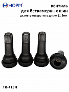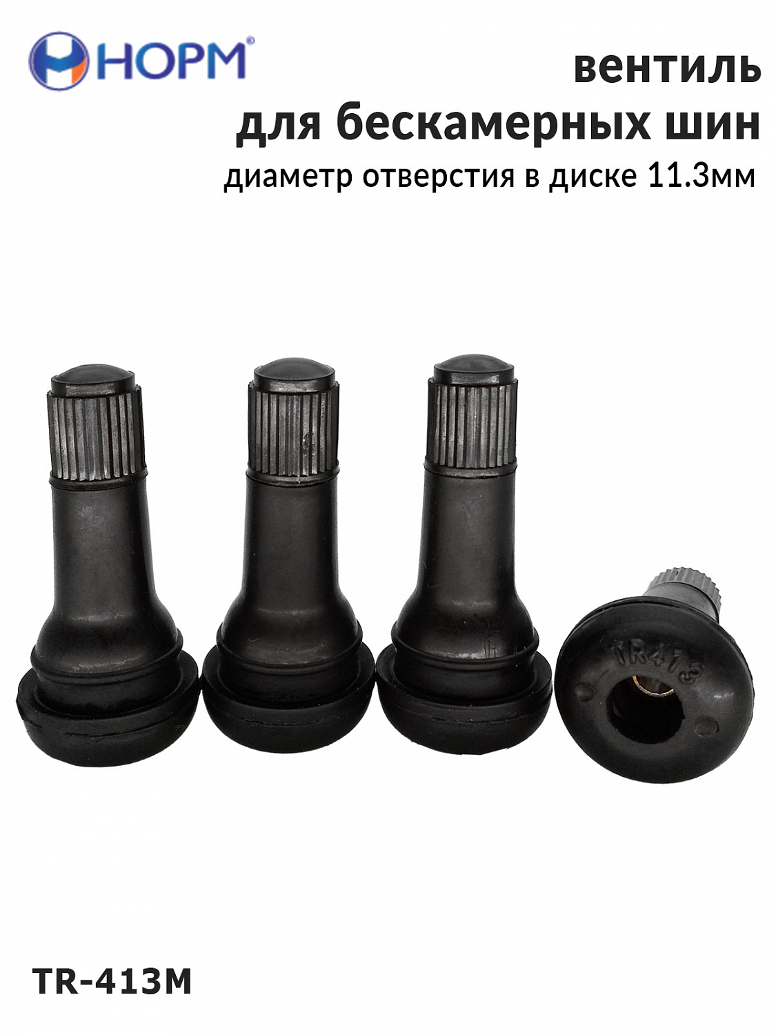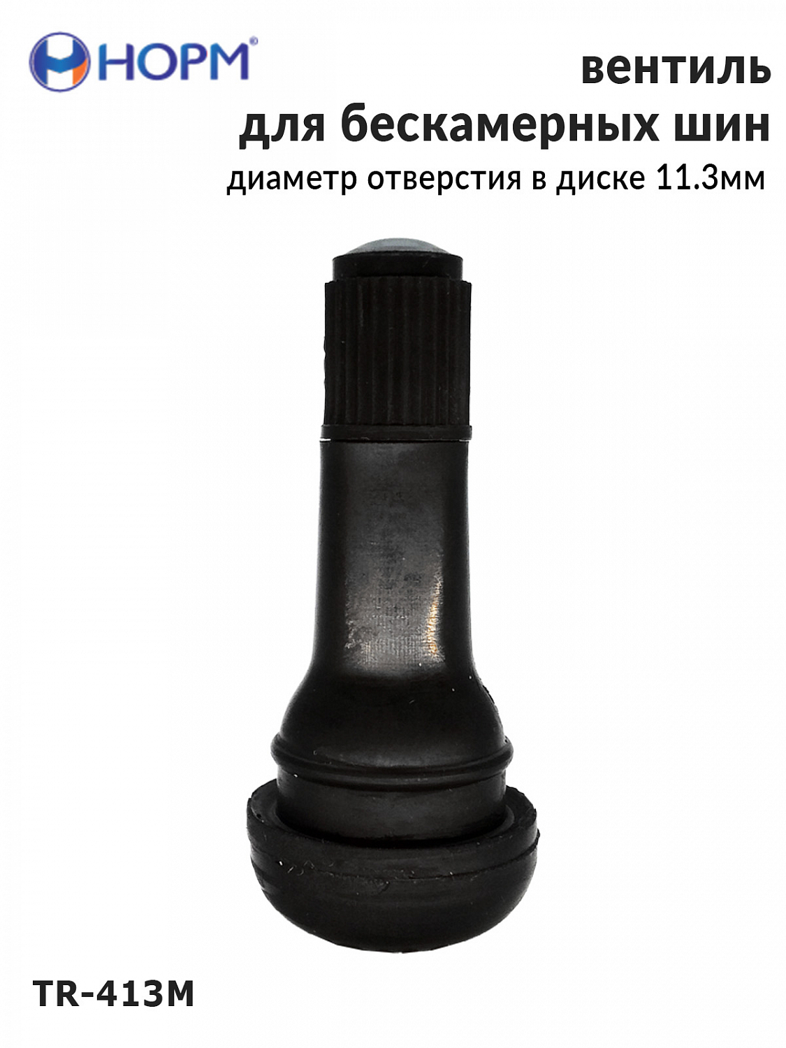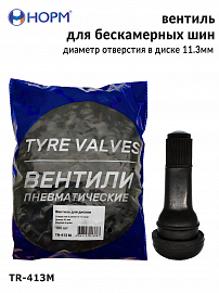 Резиновый универсальный вентиль НОРМ (TR413М) устанавливается на любые бескамерные колеса легковых автомобилей, грузовых автомобилей малой грузоподъемности, прицепы и полуприцепы, спецтехнику с диаметром отверстия в диске 11,3мм специальным инструментом. Подходит для большинства литых и штампованных дисков.