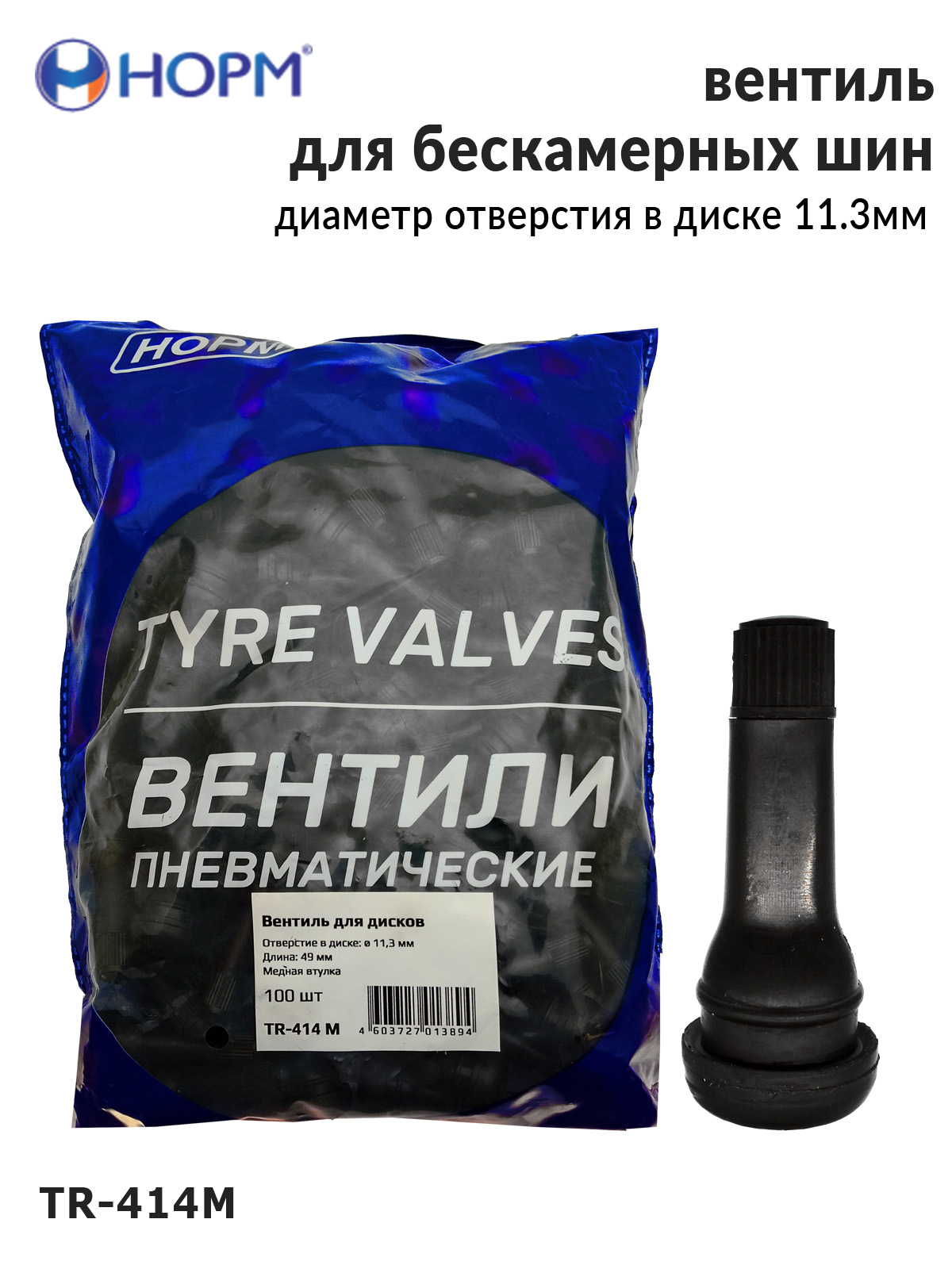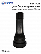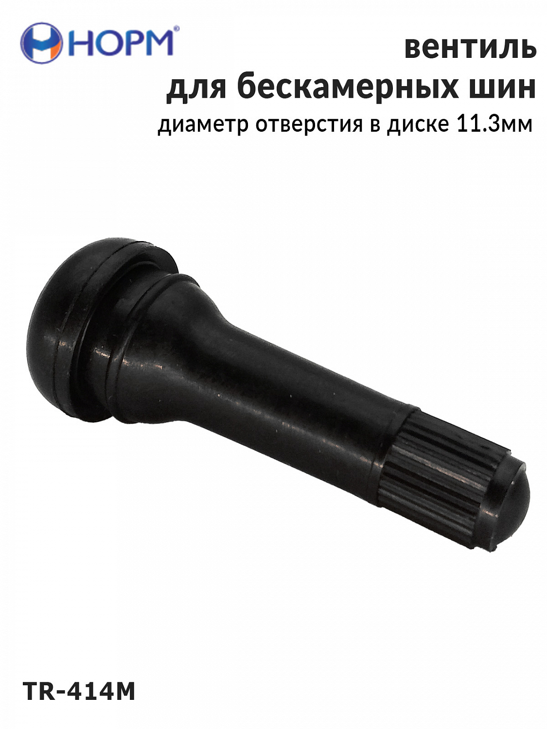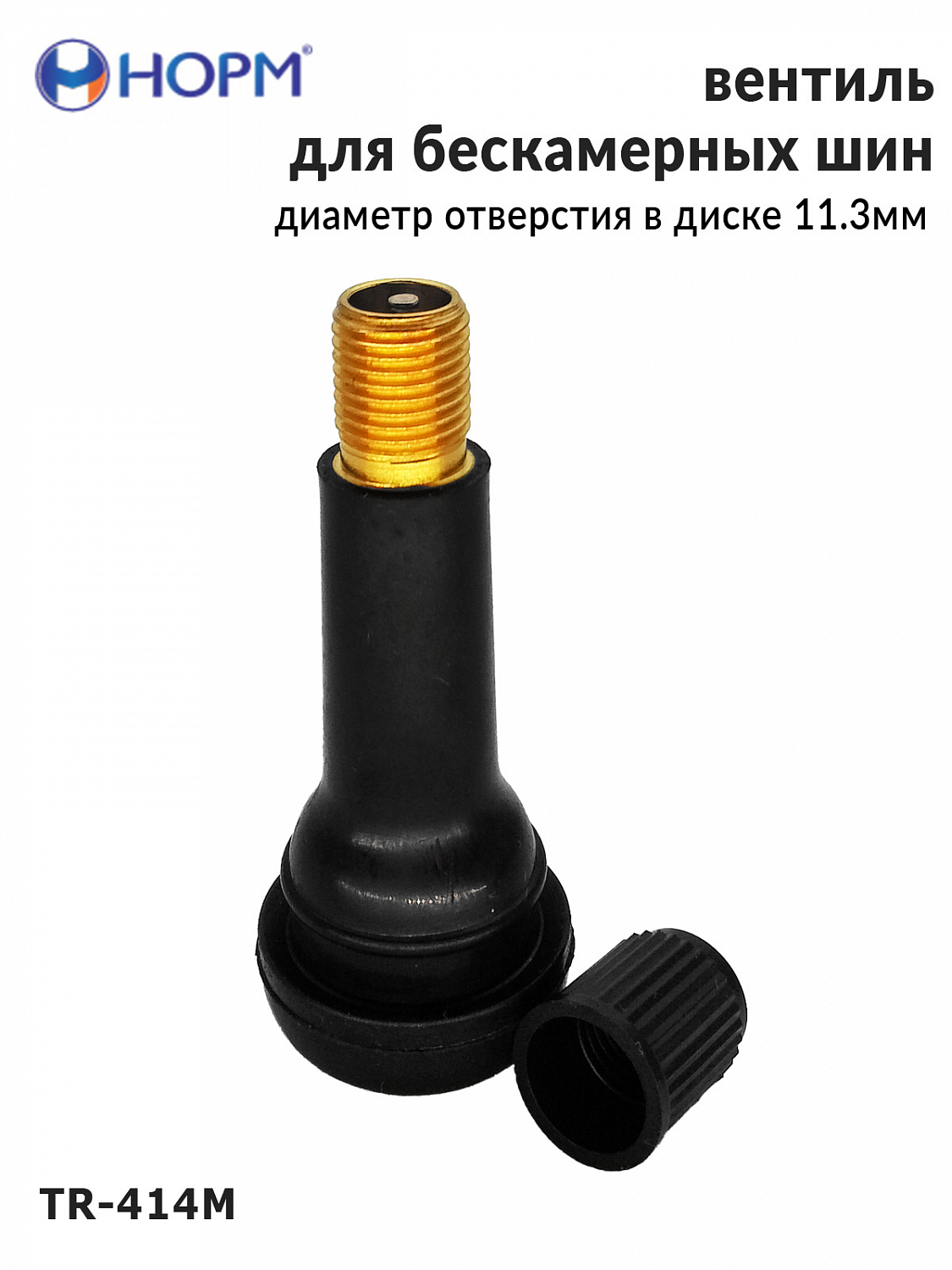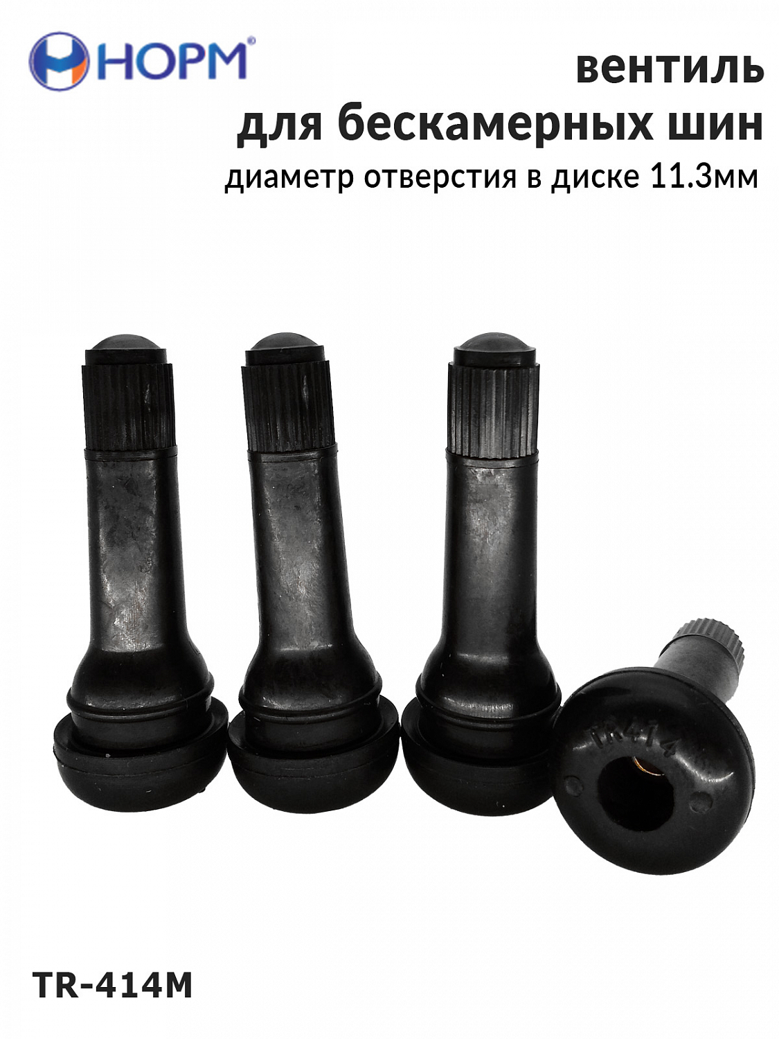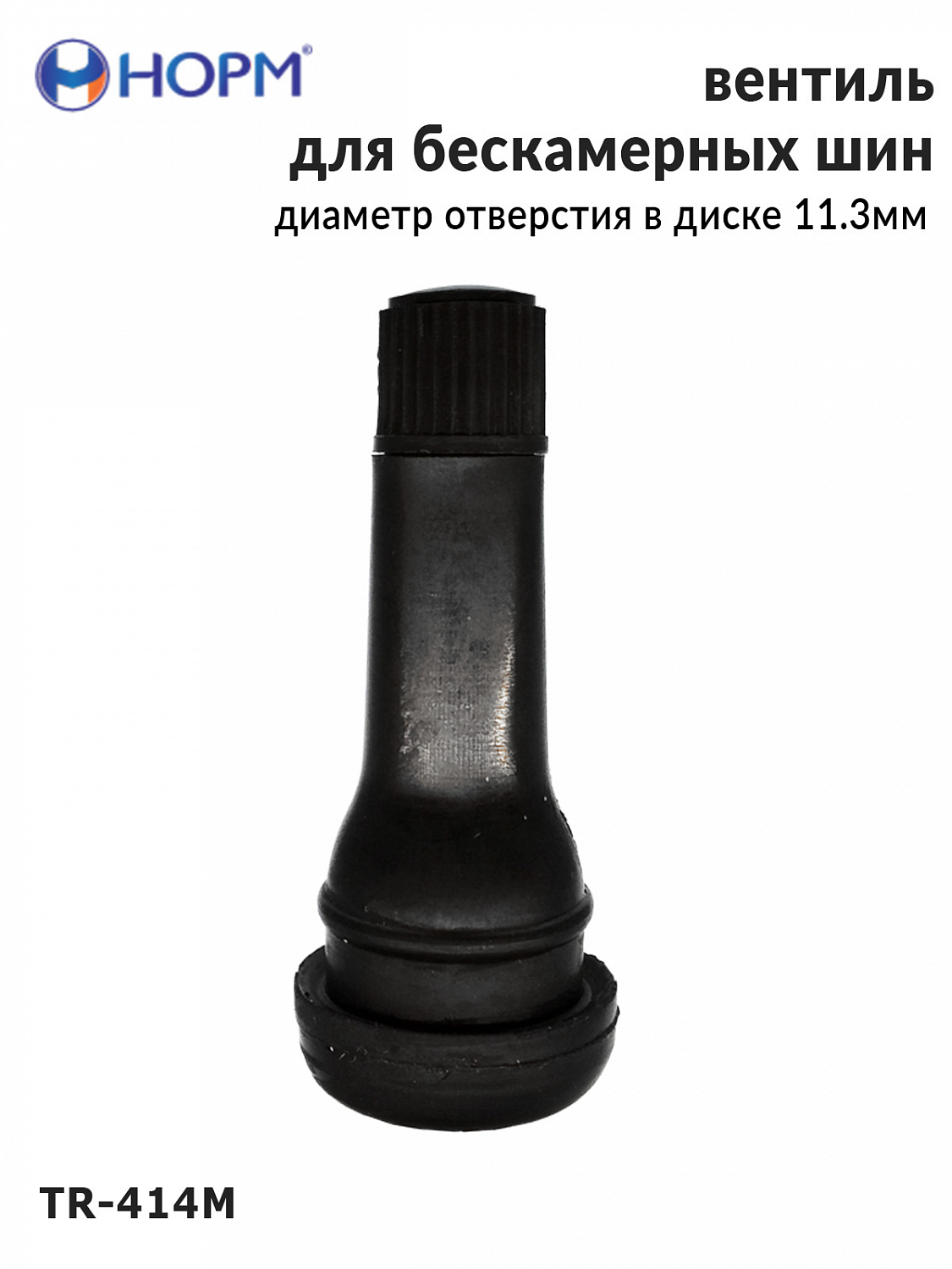 Резиновый универсальный вентиль НОРМ (TR414М) устанавливается на любые бескамерные колеса легковых автомобилей, грузовых автомобилей малой грузоподъемности, прицепы и полуприцепы, спецтехнику с диаметром отверстия в диске 11,3мм специальным инструментом. Подходит для большинства литых и штампованных дисков.