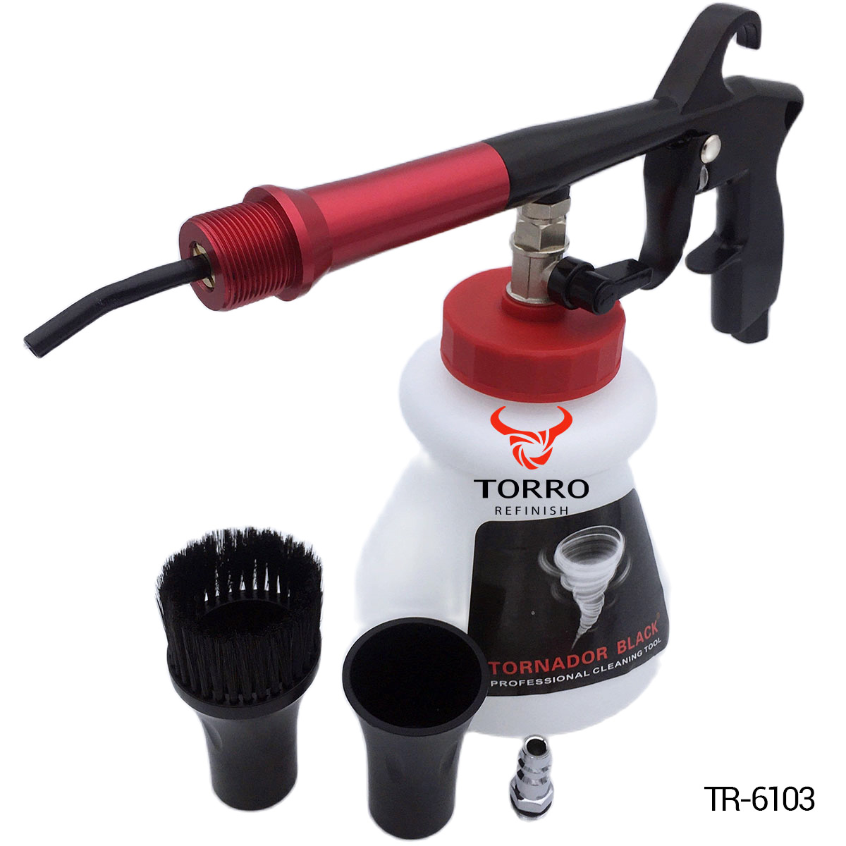 Профессиональный пневматический аппарат премиум класса TORNADOR BLACK TORRO (TR-6103) профессиональный инструмент для очистки салона автомобилей и мебели, оснащенный тремя мощными подшипниками. Помогает очищать различные интерьеры, труднодоступные места и воздуховоды с помощью давления и вихревого потока чистящей жидкости. Новая конструкция снижает износ и обеспечивает более длительный срок службы.