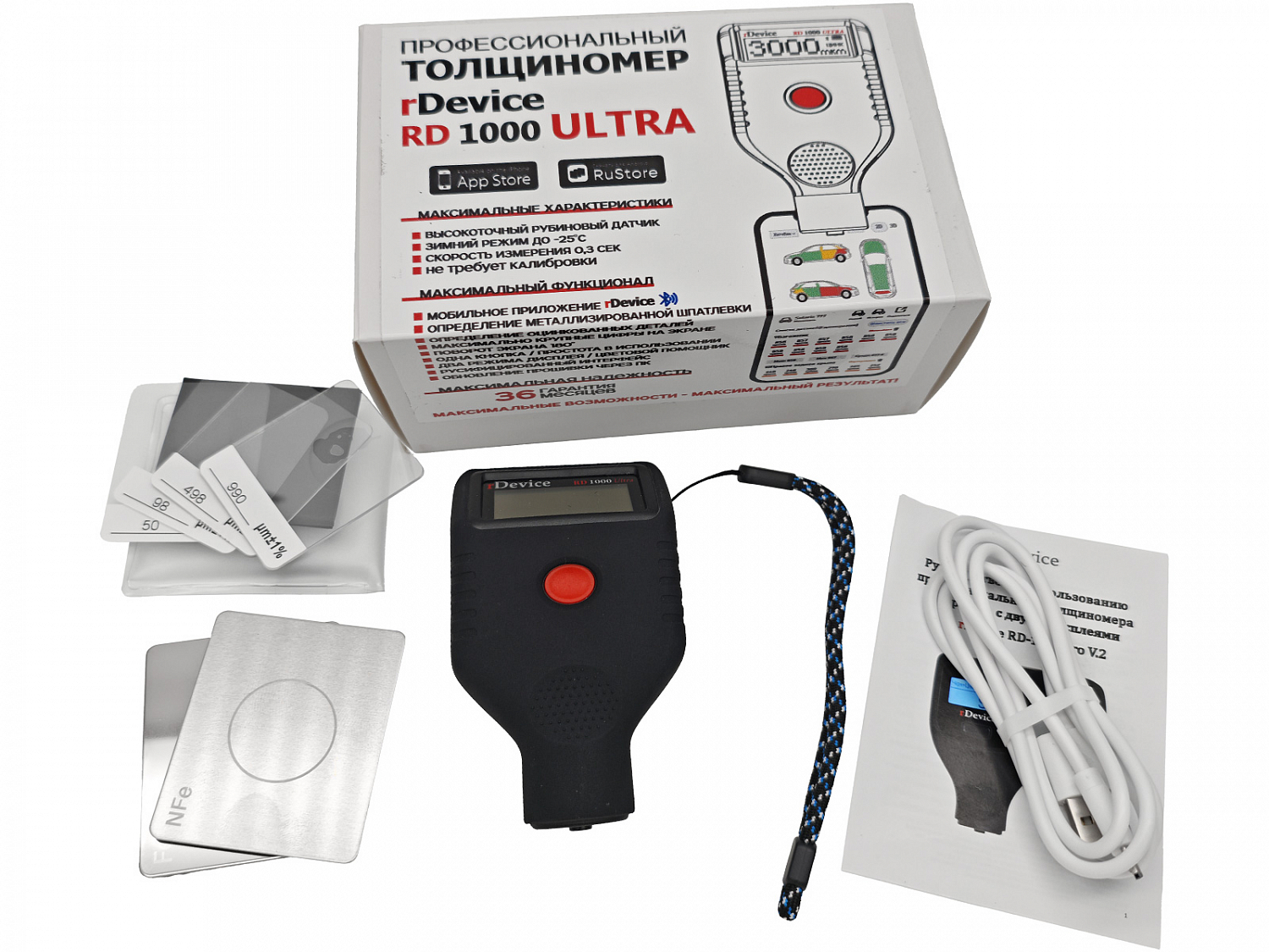 Профессиональный толщиномер RD-1000 ULTRA от rDevice - толщиномер для профессионального автоподбора, максимально возможный функционал объединенный в одном приборе, плюс максимальная надежность. Без проблем определит, если для восстановления авто использовалась металлизированная шпатлевка, проверит оцинкована деталь или нет (заменена на китайский аналог). Для определения толщины используется самый точный и дорогой, рубиновый (нестираемый датчик), с расширенным диапазоном работы до 4000 микрон и молниеносной скоростью измерений. Удобная, эргономичная форма, отлично зарекомендовавшая себя при использовании в профессиональном авто подборе, и невероятная простота в использовании (1 кнопка, инструкцией можно не пользоваться). Функция Bluetooth для работы с приложением по созданию АВТО ОТЧЕТОВ, плюс поддержка коммерческих приложений использующихся в трейдине (актуально для автосалонов). Толщиномер rDevice RD-1000 Ultra объединил в себе максимально возможный набор имеющихся на рынке опций и в данный момент является самой передовой моделью.